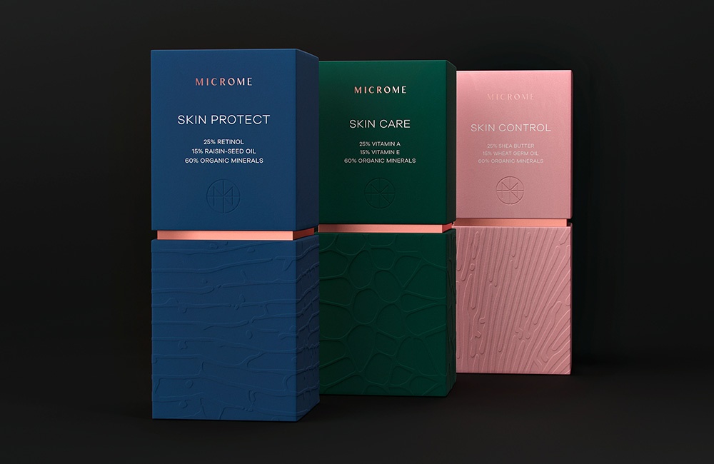 包裝設計主要目的是反映公司對產品的創新方法以及成分的天然性,但要使其對這一類別而言并非無關緊要。我們決定更深入地研究并在顯微鏡下研究化妝品的主要成分,因為其分子特性可以起到這種作用。每個對象在分子水平上都形成令人難以置信的圖案,這些圖案構成了包裝圖形概念的基礎。